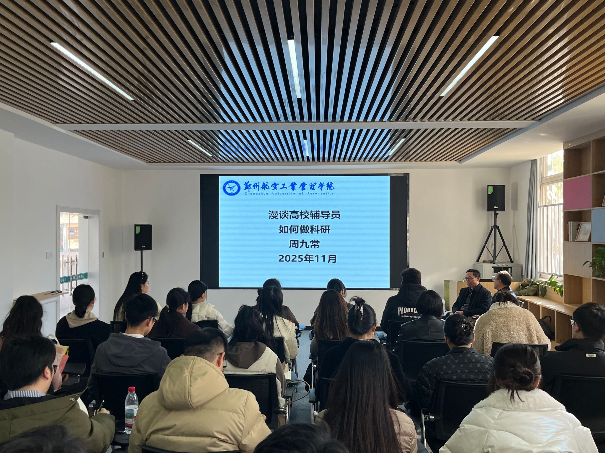 为进一步提升辅导员队伍的科研能力与学术素养,推动学校辅导员队伍专业化、职业化建设,11月20日下午,党委学生工作部在龙湖校区南苑“一站式”学生社区赋能成长中心组织开展2025年第3期辅导员沙龙活动,本次活动邀请郑州航空工业管理学院周九常教授为大家带来题为《漫谈高校辅导员如何做科研》的讲座。